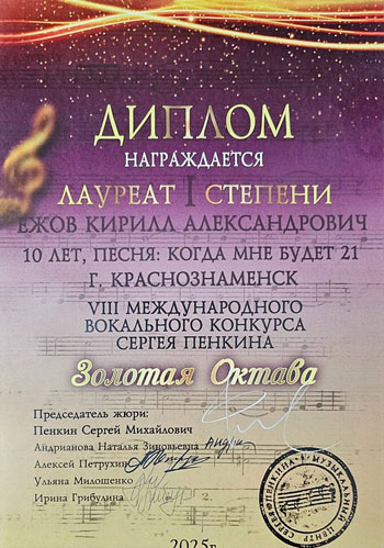 Международный вокальный конкурс «Золотая октава» Сергея Пенкина20.04.25 г. обучающийся Образцового детского коллектива МО «Театр песни «Ассоль» - Ежов Кирилл (руководитель - Правило Е.Ю.) принял участие в VIII Международном вокальном конкурсе «Золотая октава» Сергея Пенкина, г. Москва. Жюри высоко оценило выступление нашего конкурсанта: 10/10/10/9,5/10. Совсем немного помешало волнение, но каждый раз опыт прибавляет уверенности юному вокалисту. Поздравляем Кирилла с победой и званием ЛАУРЕАТА 1 СТЕПЕНИ!!! Желаем высокого полета и радости творчества!