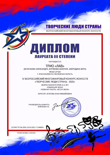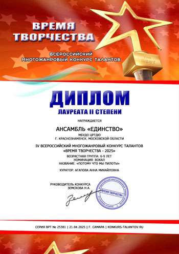 Достижения вокально-эстрадной студииВ IV Всероссийском многожанровом конкурсе искусств «Творческие люди страны 2025» Трио «Лав» (Беленкова Александра, Бурякова Валерия и Забродина Вера) творческого объединения "Вокально-эстрадная студия" под руководством Агаповой Анны Михайловны получили звание Лауреата 3 степени. В IV Всероссийском многожанровом конкурсе талантов «Время творчества 2025» ансамбль «Единство» стал лауреатом 2 степени. Поздравляем!!!
