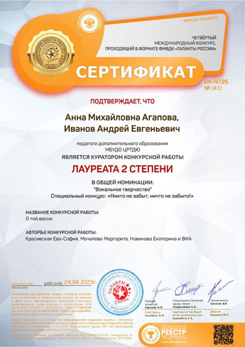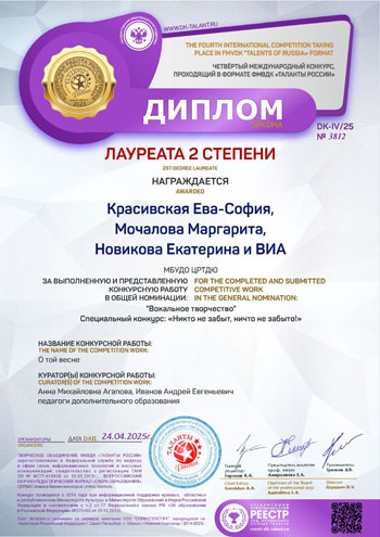 IV Международный конкурс «Таланты России»В IV Международном конкурсе «Таланты России» лауреатами 2 степени стали Красивская Ева-София, Мочалова Маргарита, Новикова Екатерина и ВИА. Поздравляем обучающихся творческих объединений: «Вокально-эстрадная студия» (педагог Агапова Анна Михайловна) и «Вокально-инструментальный ансамбль» (педагог Иванов Андрей Евгеньевич)!