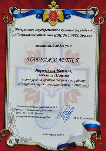 Состоялось награждение победителей конкурса на лучшую творческую работу "Пожарная охрана глазами детей"Поздравляем Ларюшкину Наталью, обучающуюся творческого объединения "Юный художник" Центра развития творчества детей и юношества (педагог Корягина Кристина Анатольевна). Желаем дальнейших успехов