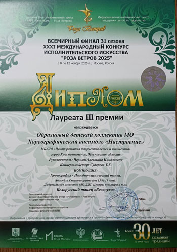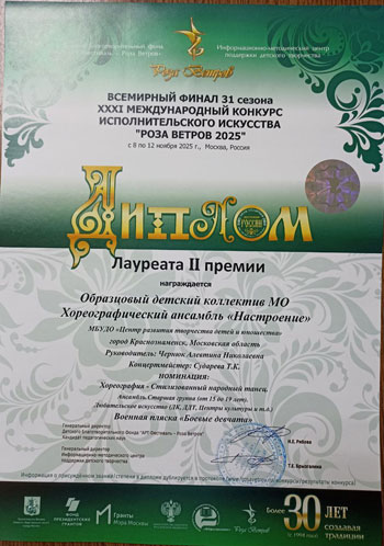 Наши победы на Всемирном финале «Розы ветров – 2025»!10 ноября 2025 года Образцовый детский коллектив МО — Хореографический ансамбль «Настроение» ( педагог - Чернюк А. Н., концертмейстер Сударева Т. К.) принял участие во Всемирном финале XXXI Международного конкурса исполнительского искусства «Роза ветров – 2025», который проходил в Концертном зале «Измайлово» города Москвы.