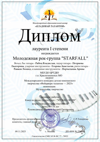 Международный конкурс детско-юношеского творчества «Фейерверк талантов - 2025»Поздравляем обучающихся молодежной рок-группы «STARFALL» творческого объединения «Вокально-инструментальный ансамбль» Центра развития творчества детей и юношества (педагог Иванов Андрей Евгеньевич) с получением диплома Лауреата I степени в Международном конкурсе детско-юношеского творчества «Фейерверк талантов - 2025» в номинации «Музыкальное творчество». Желаем обучающимся и педагогу новых творческих свершений и побед!