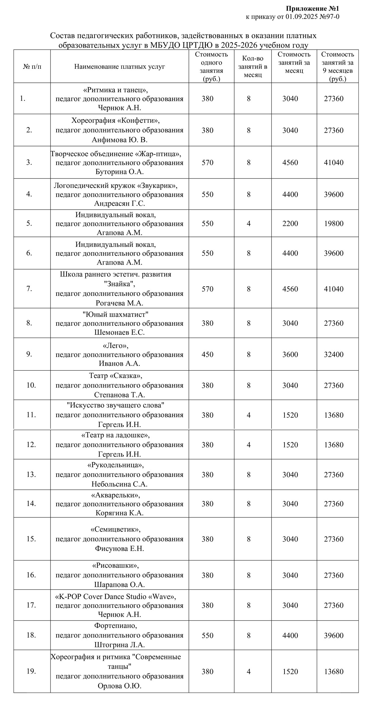 ![]() Платные образовательные услуги оказываются только по желанию родителей (законных представителей) обучающихся. Преподавание в платных группах ведется педагогами высшей и первой квалификационной категории. За более подробной информацией звоните по тел. 8 (498) 676-06-27 заместителю директора Омельянюк Ирине Владимировне. Администрации важно знать Ваши запросы на спектр платных дополнительных услуг, оказываемых в ЦРТДЮ. Свои предложения можете присылать нам по электронной почте: ctrdu-kras@mail.ru ![]() ![]() Приложение 1. Положение о порядке предоставления дополнительных платных услуг и предпринимательской деятельности Приложение 2. Образец Договора на предоставление дополнительных платных образовательных услуг. |