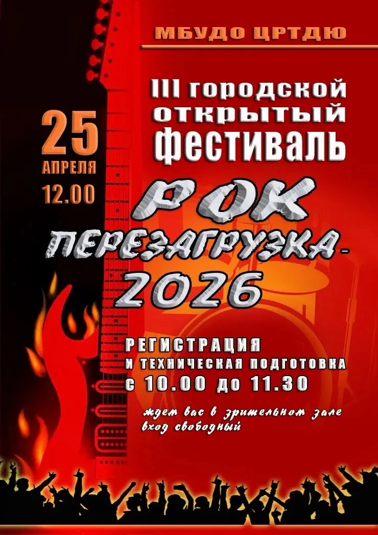 Рок-перезагрузка 2026МБУДО «Центр развития творчества детей и юношества» приглашает принять участие в III городском открытом фестивале «Рок-перезагрузка», который пройдет 25 апреля в 12:00 в зрительном зале Центра