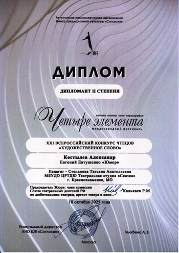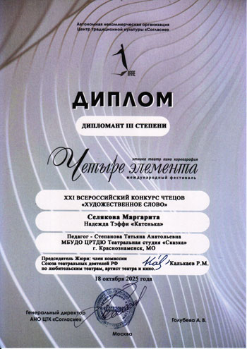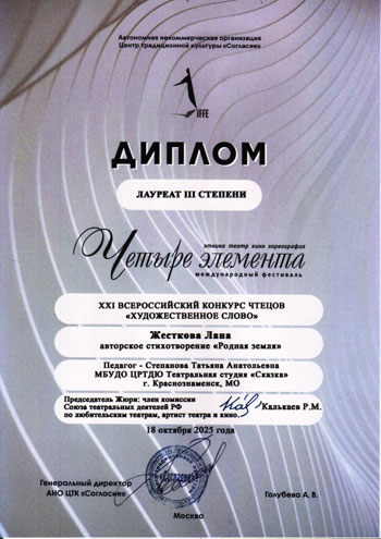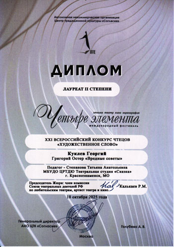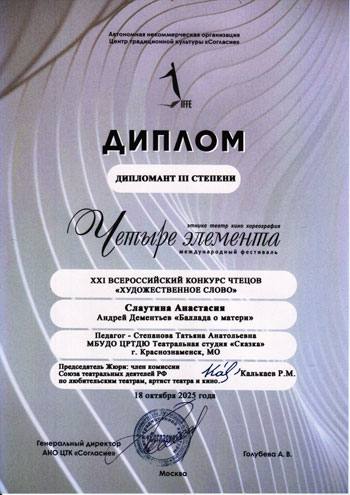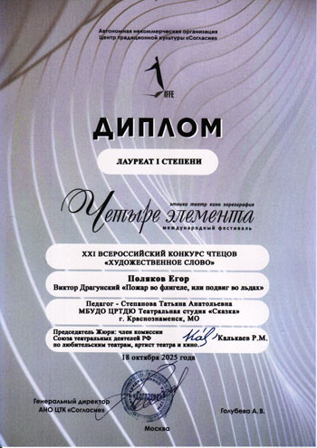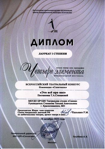 Приятно побывать в такой творческой атмосфере! Но еще приятнее быть первыми среди лучших! Радость переполняет сердца юных актеров, их родителей и всех, кто болел за нашу театральную студию «Сказка»! Мы - Лауреаты 1 степени Международного фестиваля «Четыре элемента»!