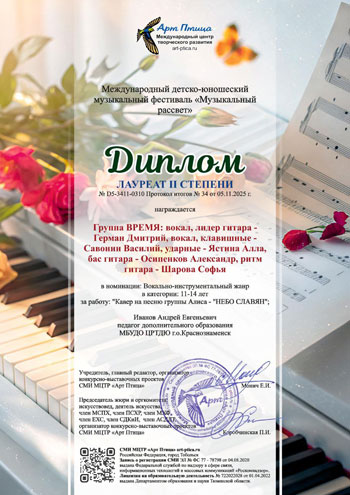 Вокально-инструментальный ансамбль "Время" ЦРТДЮ принял участие в Международном детско-юношеском музыкальном фестивале «Музыкальный рассвет»Обучающиеся творческого объединения «Вокально-инстурументальный ансамбль» Центра развития творчества детей и юношества (педагог Иванов Андрей Евгеньевич) приняли участие в Международном детско-юношеском музыкальном фестивале «Музыкальный рассвет»( онлайн). Поздравляем с получением диплома II степени группу «Время» (вокал, лидер гитара - Герман Дмитрий, вокал, клавишные - Савовнин Василий, ударные - Ястина Алла, бас гитара - Осипенков Александр, ритм гитара -Шарова Софья) в номинации «Вокально-инструментальный жанр» в категории 11-14 лет за работу «Кавер на песню группы Алиса - «НЕБО СЛАВЯН». Желаем новых творческих успехов обучающимся и их педагогу!