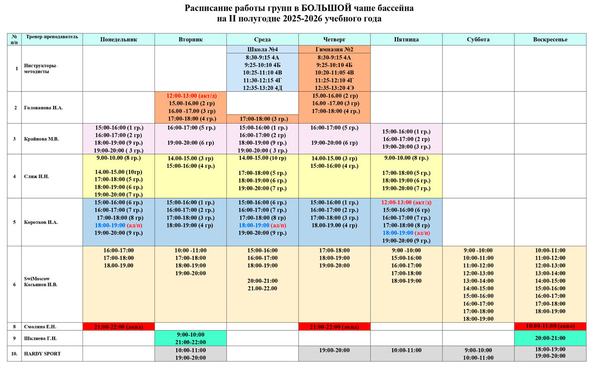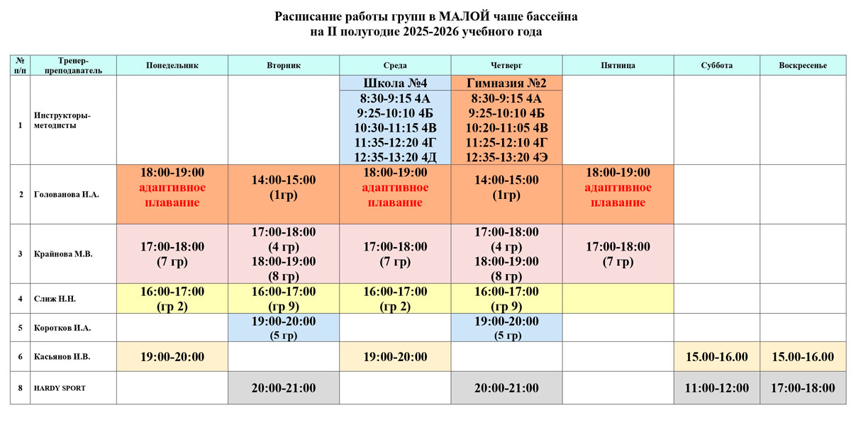 Расписание работы бассейна на второе полугодие 2025-2026 учебного года